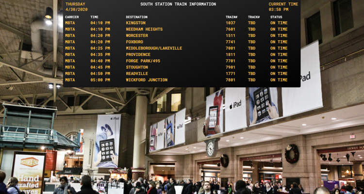 A real-time representation of the train departure board at Boston's South Station terminal. This project is built in React.js and utilizes the powerful Massachusetts Bay Transit Authority developer API and its streaming service to consistently update train departure predictions.
