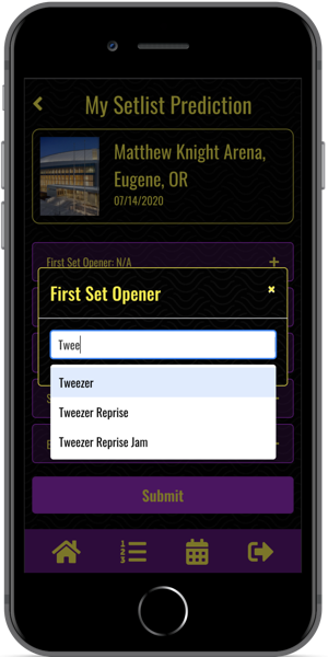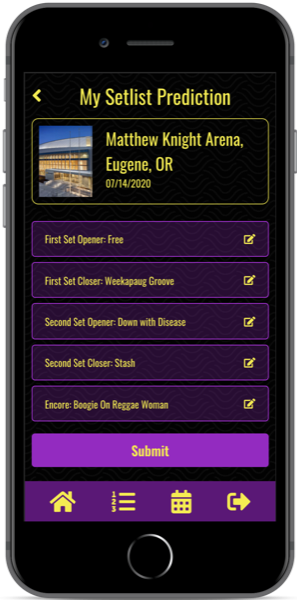- Mobile-first web interface for viewing upcoming concerts, making predictions, and comparing your score to your friends.